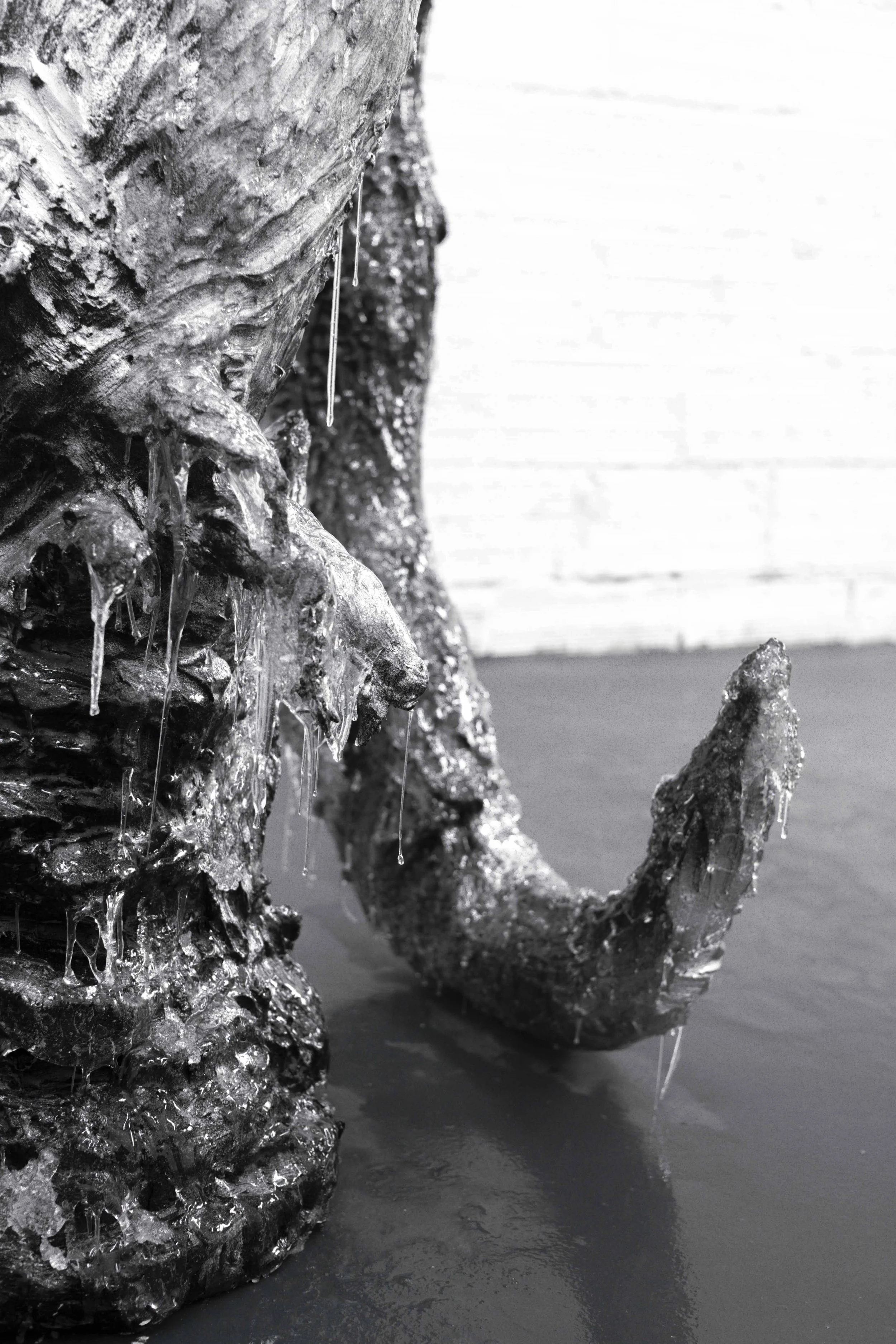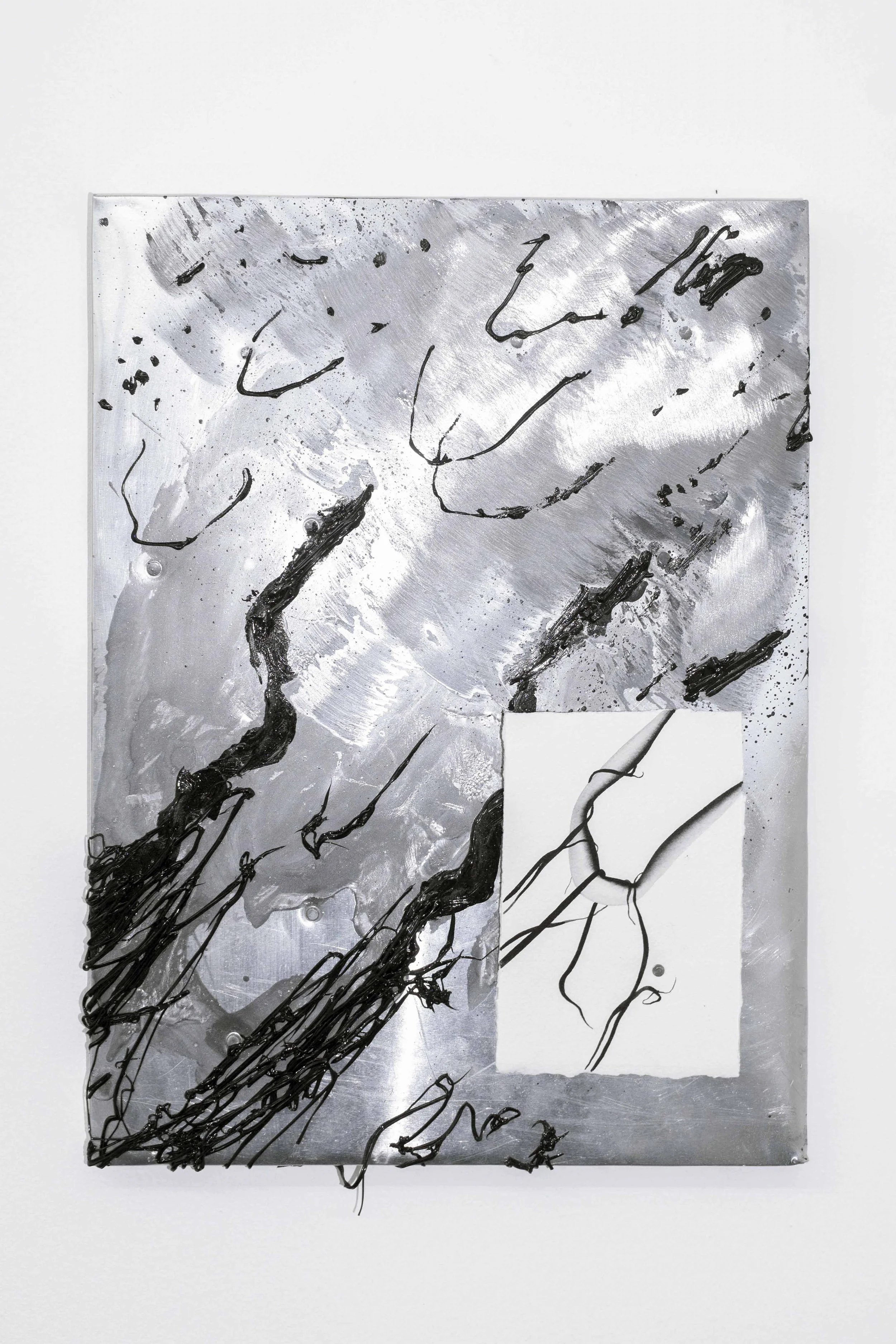 In contrast, Stamers works evoke a darker, more textured atmosphere, using scorched and layered materials to explore decay, transformation, and regeneration.